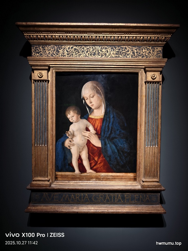 《圣母子》,乔凡尼·贝利尼,约1480-1485年,木板,蛋彩与油彩混合,985 ×829×134mm。贝利尼中期创作的众多圣母子题材作品中,典型特征为圣母出现在大理石栏杆后,这一设计既为三角形构图提供了稳固基底,又通过空间区隔将神圣人物与观者所处的现实世界分离。这幅作品的独特之处在于圣母与圣子的视线并未聚焦于画面内部,而是朝向画外左下方,仿佛圣子正在为一位画外跪拜的供奉者赐福。画家采用深色中性的背景,而非常见的帷幕、风景或天空,以简洁的构圈、安静的氛围打动人心。