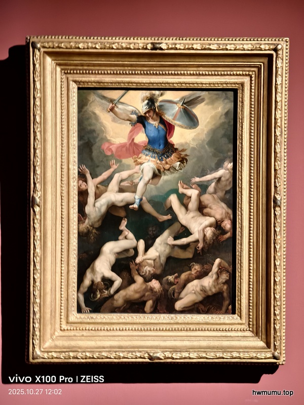 《大天使米迦勒与反叛天使》,朱塞佩·切萨里,约1592–1593年,涂层铜板油画,815×653×95mm。这幅画出自朱寨佩·切萨里之手,他更以其荣誉称号“阿尔皮诺骑士”而广为人知。这幅面生动地展现了大天使米迦勒身披古罗马战士的盔甲,将反叛天使驱逐出天堂的壮丽场景。路西法本是天使长,却堕落成邪恶的化身,被世人称为魔鬼或撒旦,常化身为巨龙形象与圣米迦勒较量,这一主题在艺术史上广受欢迎。