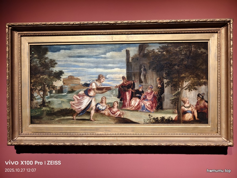 《图西亚的考验》,丁托列托,約1555年,布面油画,708 ×1255 ×95mm。古罗马维斯塔女神的祭司图西亚被指控失贞,为证明清白,她以布满孔洞的漏篮从台伯河取水并成功运回。画面描绘她手捧水篮,匆匆奔向一群头缠巾带的罗马祭司。前景左侧的圆形堡垒式建筑和跨河桥梁,象征罗马城与台伯河。