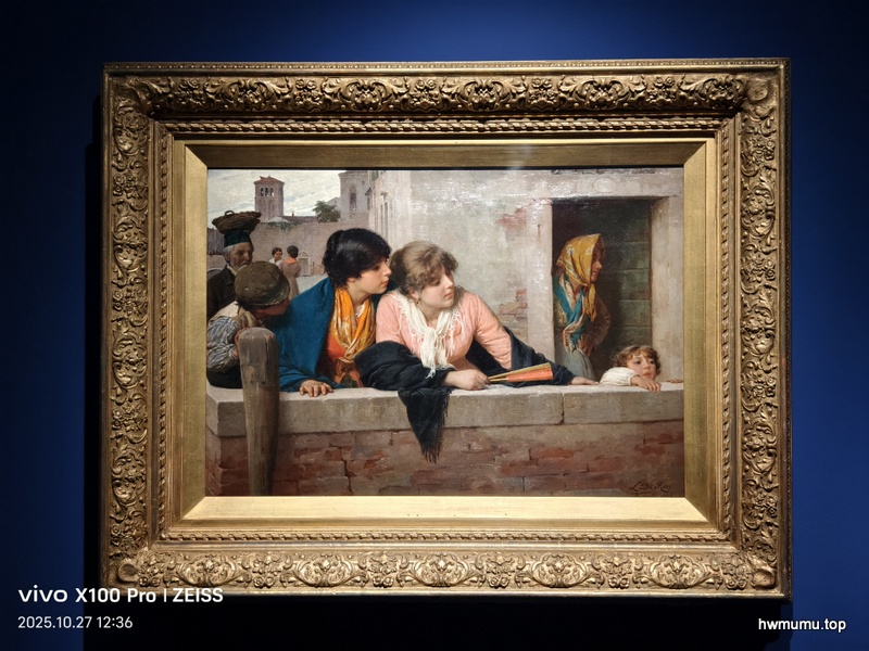 《俯瞰威尼斯运河》,路易吉・达·里奥斯,1886年,布面油画,760×969×112 mm。画作背景中教堂高耸的钟楼可辨认为圣尼科洛乞丐教堂,位于威尼斯六大区之一的多尔索杜罗区。画面捕捉了工人社区的日常场景:妇女儿童们趴在运河边墙上,正张望着画框外发生的趣事。这幅威尼斯风情画是里奥斯作品的典型代表。他的创作主题以日常生活为主,尤其偏爱描绘威尼斯的日常景象,擅用油画与水彩画两种形式。