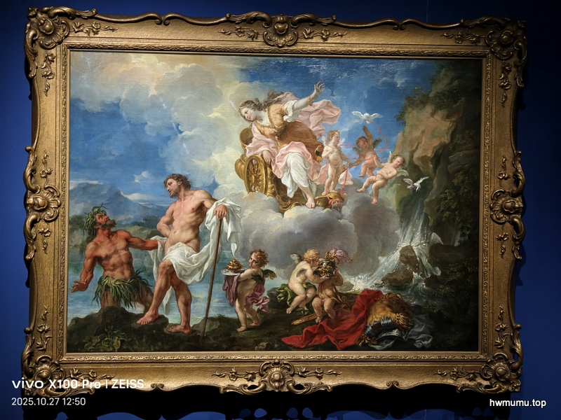 《埃涅阿斯成神仪式》,皮尔·莱昂·盖齐,约1725年,布面油画,1216×1590×107 mm。这幅画作描绘了罗马诗人奥维德《变形记》中的故事,埃涅阿斯去世后,因为母亲维纳斯的恳求,朱庇特赋予了他永生。河神努米基乌斯负责净化他的凡人之躯,而维纳斯则使用神药让他脱胎换骨,从而实现了从凡人到神衹的转变。画面上,维纳斯正指挥着净化仪式的进行,小天使在一旁嬉戏。画面左侧是戴着王冠、身着芦苇腰布的努米基乌斯,旁边则是已经卸下盔甲、准备踏入端急河流的埃湿阿斯。