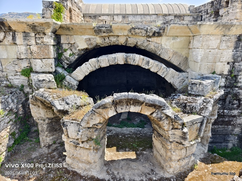 Frontinus大门由石灰华块制成,有三个拱门。两侧的圆形塔楼采用希腊城门风格。街道东侧的大门内是厕所。它建于 1 世纪,有一排柱子隔开两个房间。该厕所对希拉波利斯的公民免费开放。