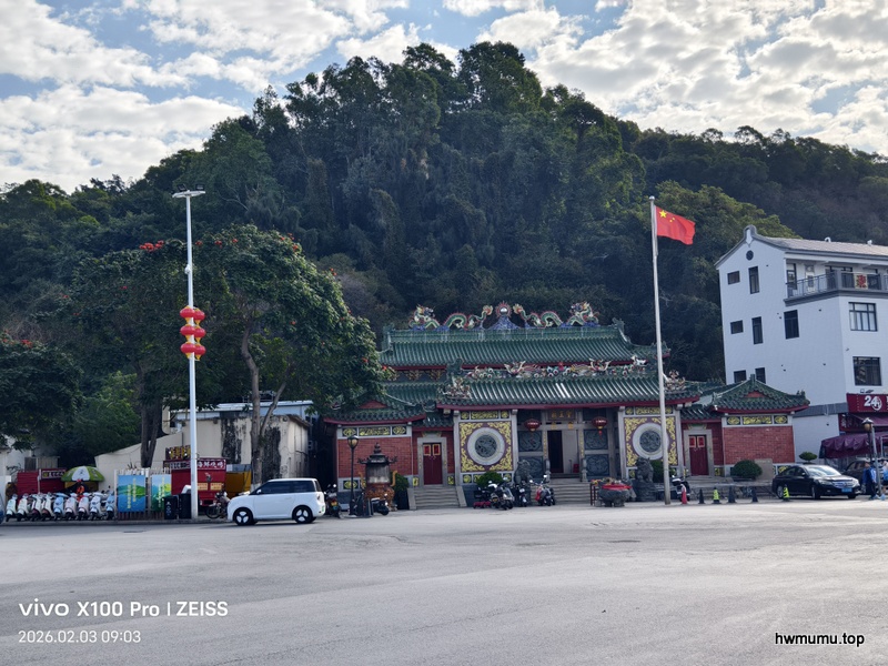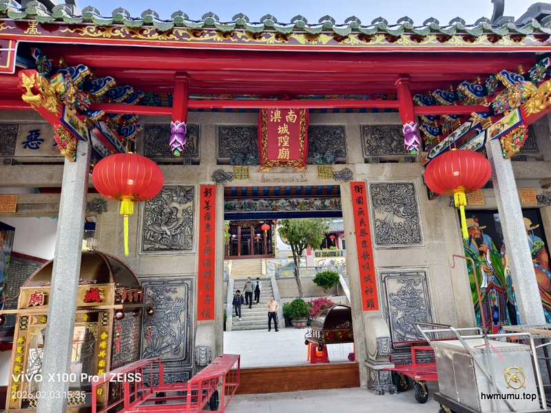 这是南澳最大的武帝庙。它始建于清雍正年间,距今有二百多年的历史。武帝庙的建筑整体上是翠绿色,屋顶装饰使用了潮汕地区最常用的嵌瓷工艺,将一些花鸟、人物都是形象地展现到屋顶上了。武帝庙的外面,有很多金漆画,里面也是一个个中国民间故事。大殿正中央是关帝像。