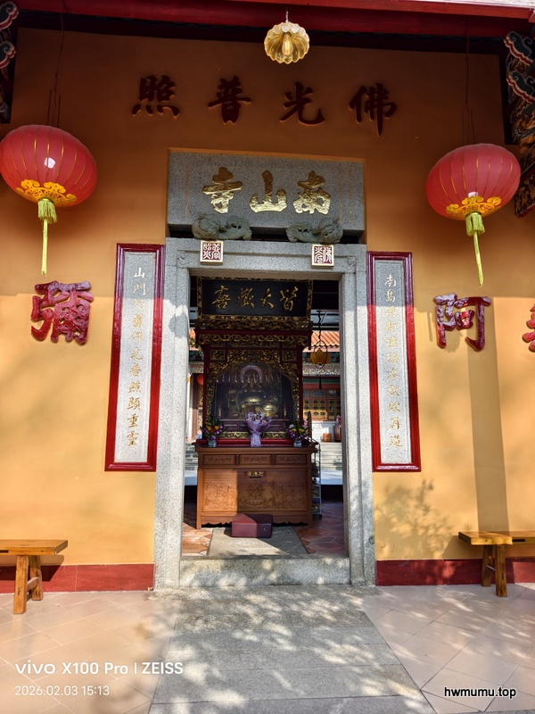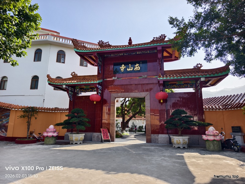 南山寺位于南澳县深澳镇金山村,地处独鲤朝阳,后枕金山,面朝梅花村,属热带海洋雨林季风性气候,周边古树参天,坑泉潺潺,闽南佛殿建筑风格显著,主体建筑包括大雄宝殿、天王殿、观音阁等,采用橙色琉璃瓦覆顶 。该寺始建于明末,原为火神爷小庙扩建而成,现存门楼匾额”南山”二字为清初进士出身僧人墨迹,”寺”字为后人补题。寺院历经多次兴废:1918年地震仅存门楼,1922年由尼师释修彻、修解主持重建,1927年竣工。1978年后陆续完成大雄宝殿(1994-1998年)、观音阁(1990年)等扩建工程,总投资逾400万元 。现为南澳县文物保护单位,收录于南澳旅游景点列表,与雄镇关、青澳湾等景区并列。2025年深澳镇新春文化集市活动中,该寺被设为集章打卡点,活动吸引约1.2万人次参与。