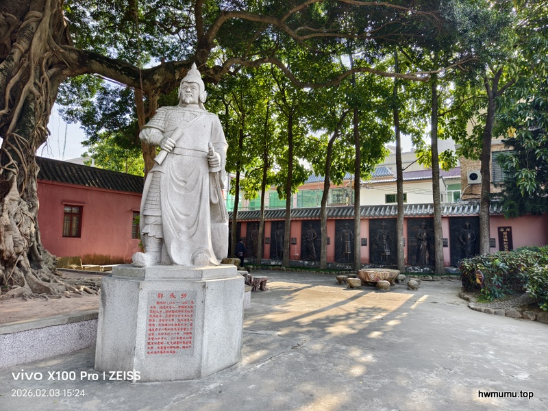 郑成功花岗岩雕像置于1997年。郑成功(1624年8月27日—1662年6月23日),本名森,又名福松,字明俨,号大木。 福建泉州南安人,祖籍河南固始。汉族,明末清初军事家,抗清名将,民族英雄。其父郑芝龙,其母名田川氏。因蒙隆武帝赐明朝国姓“朱”,赐名成功,并封忠孝伯,世称“郑赐姓”“郑国姓”“国姓爷”,又因蒙永历帝封延平王,称“郑延平”。郑成功是弘光时监生,1645年(清顺治二年,弘光元年)清军攻入江南,不久郑芝龙降清、田川氏在乱军中自尽;郑成功率领父亲旧部在中国东南沿海抗清,成为南明后期主要军事力量之一,一度由海路突袭、包围清江宁府(原明朝南京),但终遭清军击退,只能凭借海战优势固守泉州府的海岛厦门、金门。1661年(清顺治十八年,永历十五年)率军横渡台湾海峡,翌年击败荷兰东印度公司在台湾大员(今台湾台南市境内)的驻军,收复台湾,开启郑氏在台湾的统治。以赤嵌城为东都,建立府县,编制军队,屯田垦荒,奖励移民, 推进了台湾经济的发展。1662年(康熙元年),郑成功在收复台湾四个月后,突然暴病而亡,年仅38岁。 子郑经嗣位。初葬台南州仔尾,后迁葬于故乡南安的覆船山。海峡两岸均立像树碑纪念。有《延平王集》行世。