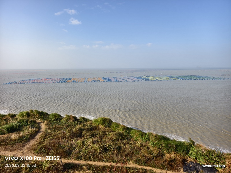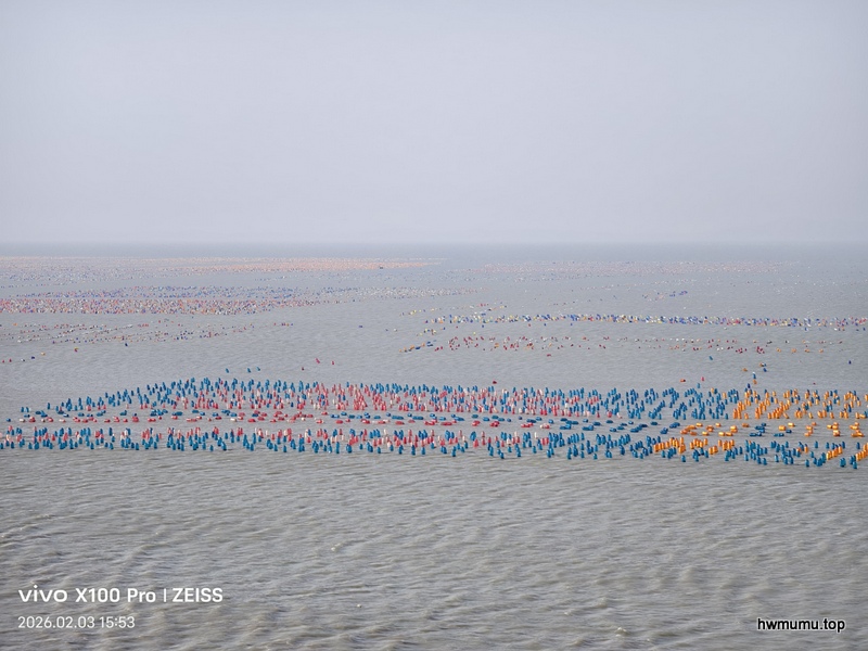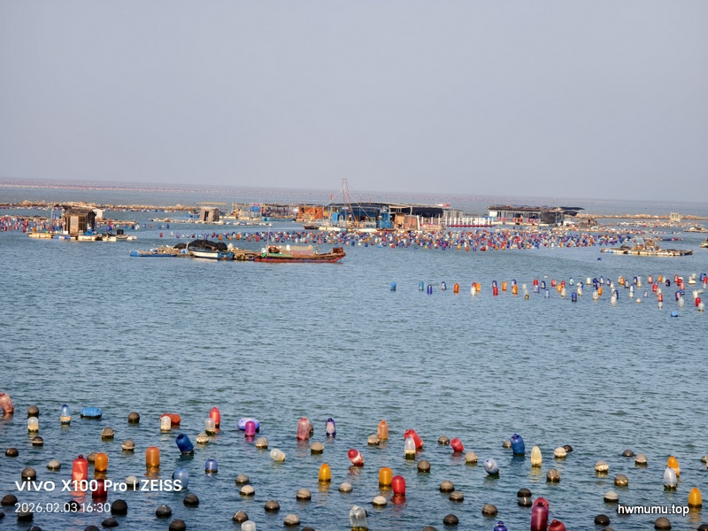 其实就是海上牧场,成片彩色透明浮球整齐排列在海面上,生产与艺术相结合的产物。