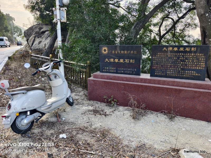 大潭摩崖石刻位于南澳县黄花山管区大潭村。大潭摩崖石刻分别在北宋政和三年(1113年)和政和五年(1115年),分两次镌刻而成。石刻高1.5米,宽1.6米,字体为楷书。碑刻上第一次镌刻分四行,内容为“女弟子欧,七中捨井,一口乞平安,癸巳十一月记”;第二次镌刻也分四行,内容为“李欧七娘同,夫黄 捨井,二口,乙未政和五年”。两题石刻之间有“匠李一”三字。而关于此石刻,还有一段特别的传说,这段传说来自一位女海盗。