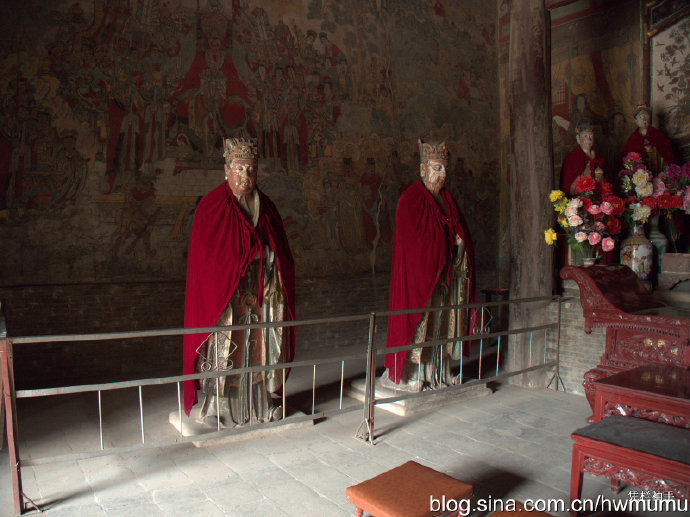 这是水神庙进门右边的情形,前面是明应王的一个随从官员,后面是东壁上的龙王降雨图。广胜寺下寺的宝贝在美国,还值得一看的就是邻居水神庙的壁画了。